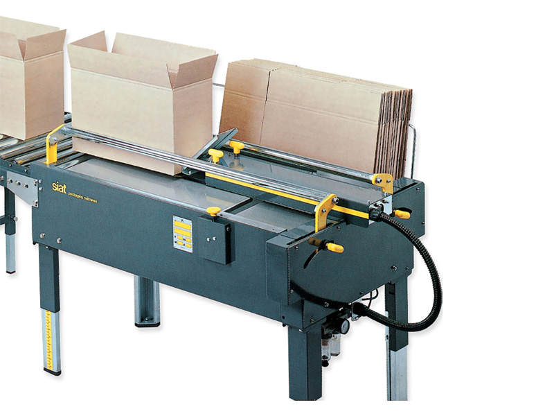 The F105 case former automatically folds the bottom flaps of the box - manually entered by an operator. The box with the bottom flaps folded remains in vertical position for filling operation. Subsequently it could be pushed through a case sealer machine for sealing with adhesive tape.